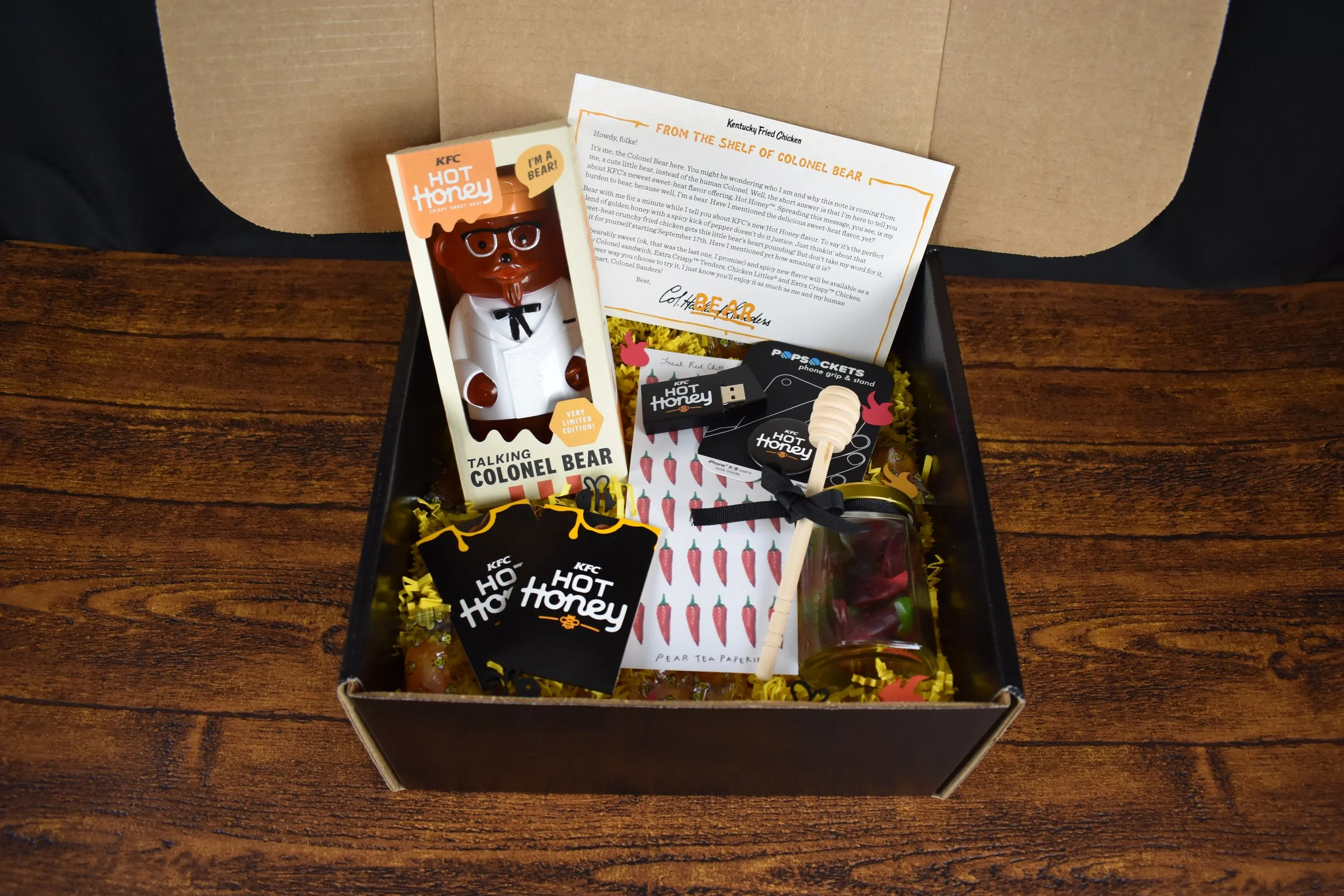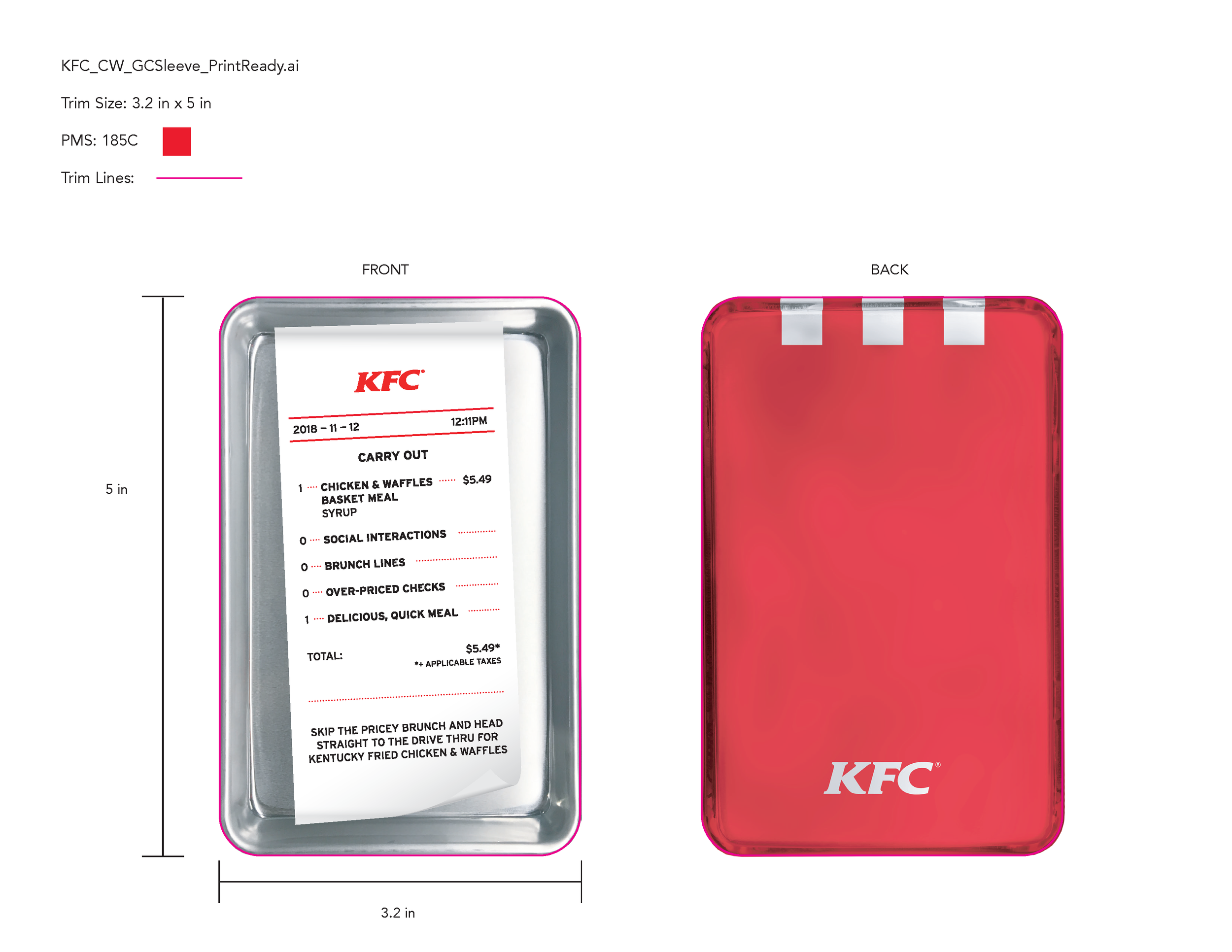 For each new product launch, KFC sends custom mailers to the media. Included in each mailer is a gift card and coordinating gift card sleeve, used to incentive the media outlets to try the new product.
